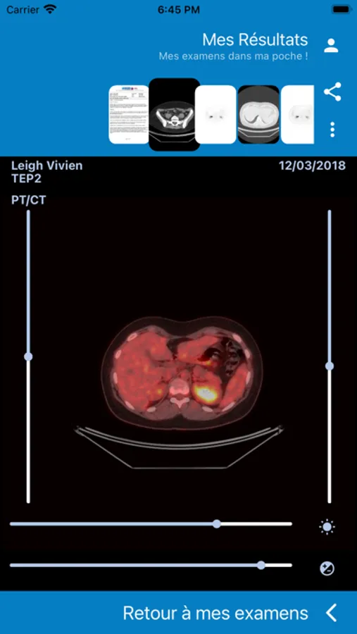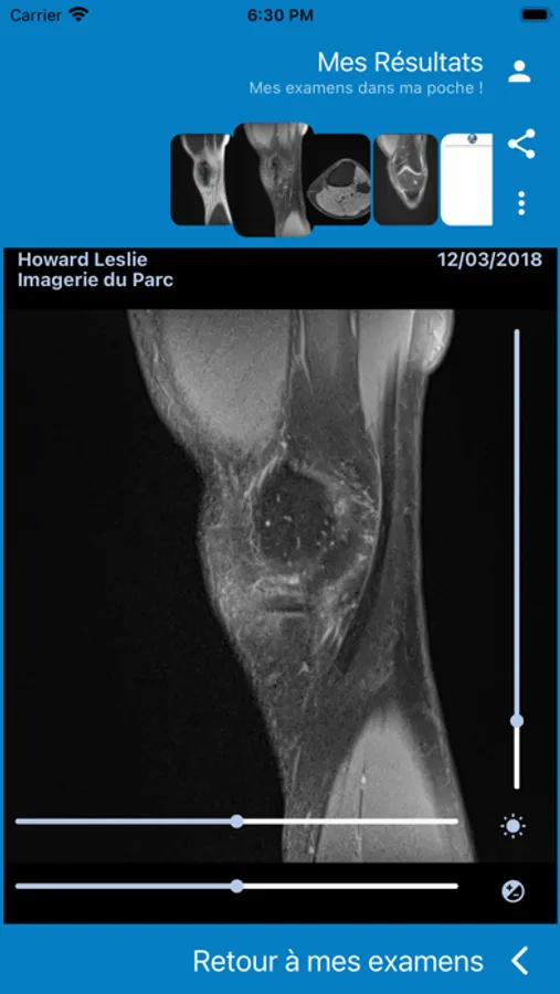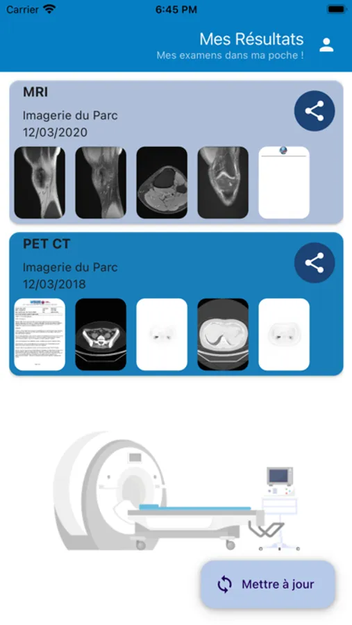 Mes résultats lets you retrieve your reports and medical images directly on your mobile phone. All your data are downloaded and saved on your mobile device. You can view and share them with everyone you want. Your exams are safe in your pocket, not on the Internet !