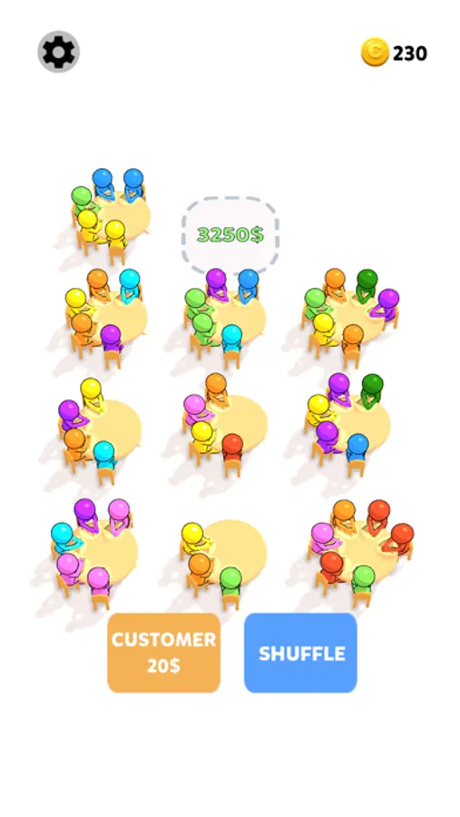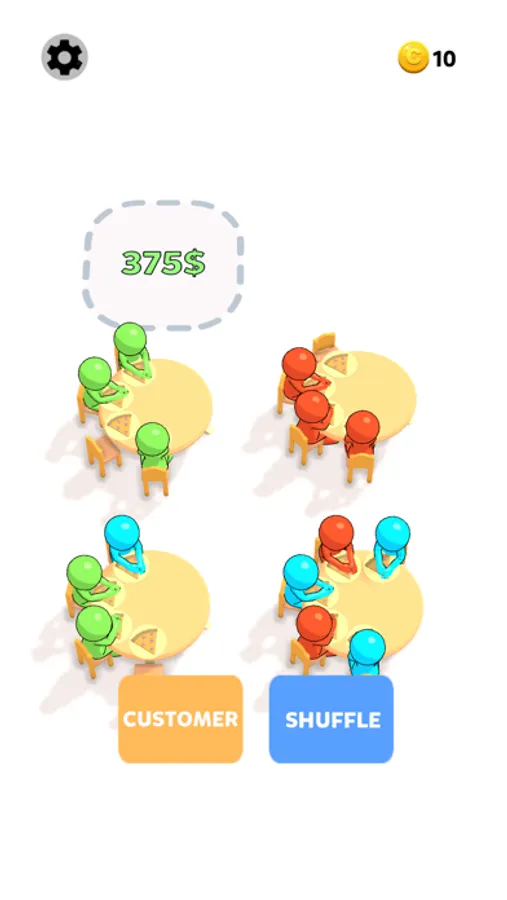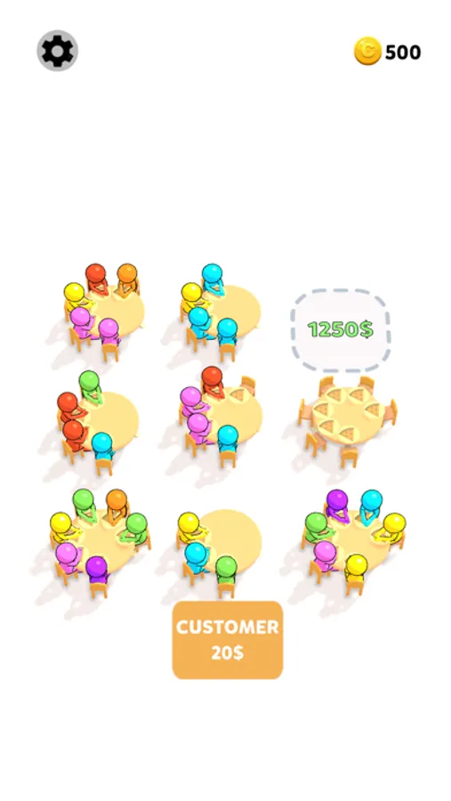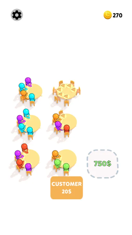 Get the same colored stickmen together at a table to eat the pizzas. Earn money and grow your business to serve more stickmen!