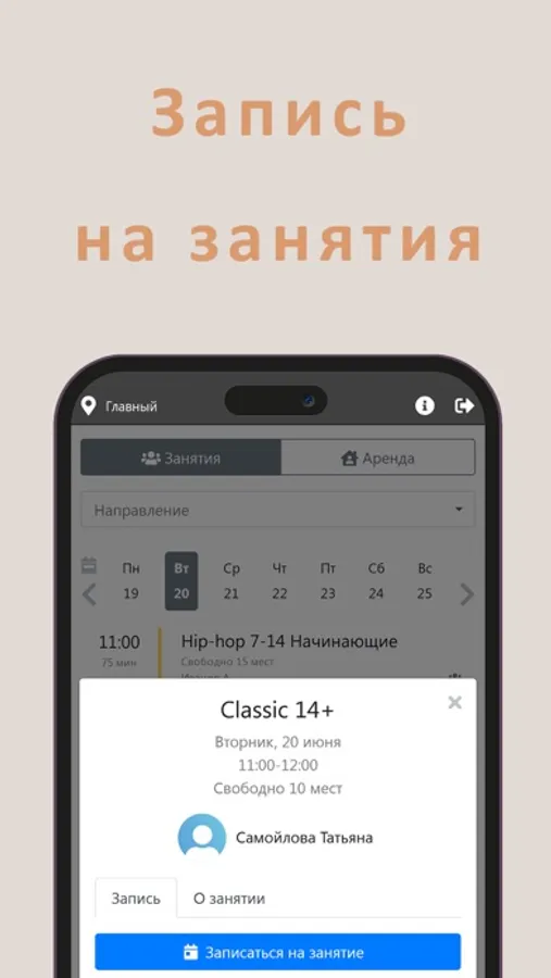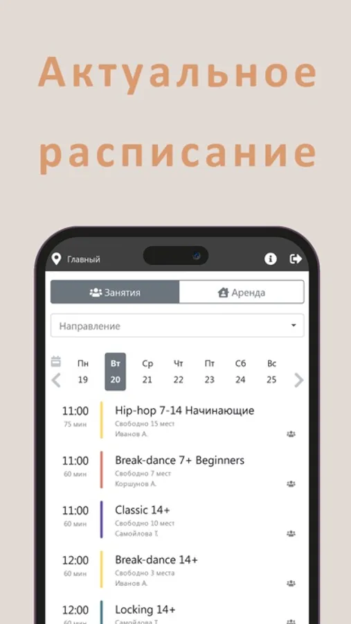 Приложения для просмотра расписания, действующего абонемента, посещений и записей на занятия йога цетра ТОТ.