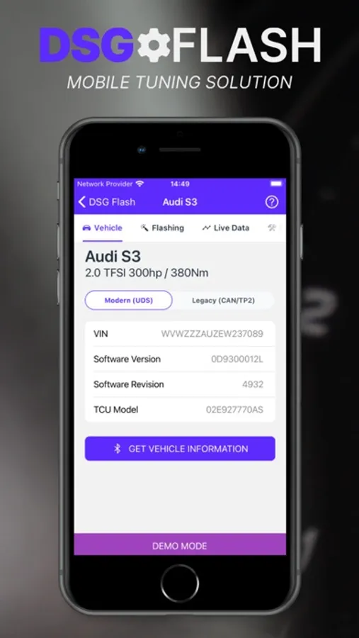 Tune your VAG gearbox at home using the DSG Flash iOS app. Customise the tune to your liking and apply our world class custom code patches! Supporting DQ250 Exx & Fxx, DQ250 MQB, DQ200, DQ381 & DQ500.