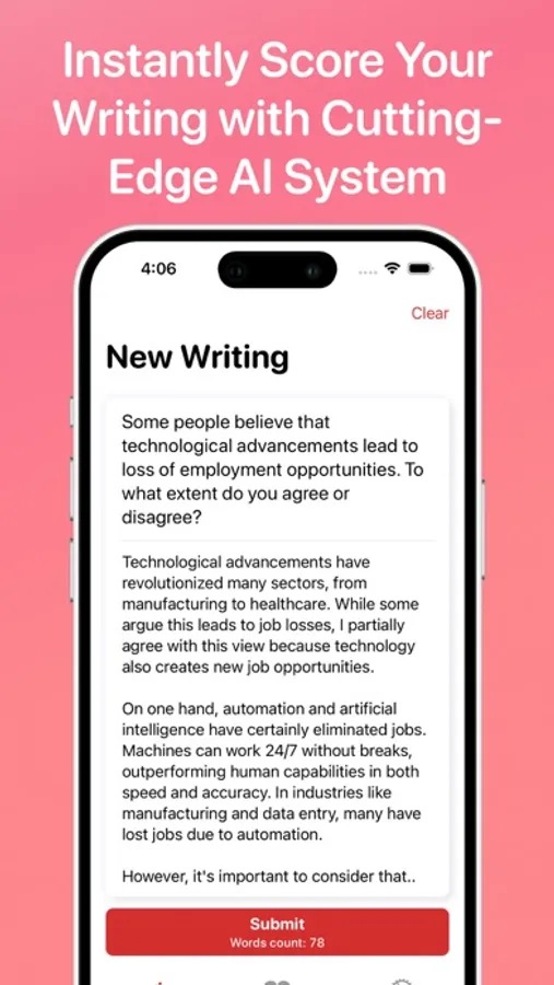 Effortlessly boost your IELTS writing with our advanced AI app. Suitable for both Academic and General tests, the app provides real-time assessments. Submit your essay or letter and receive an immediate score, personalized feedback, and a corrected version of your writing.