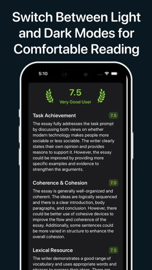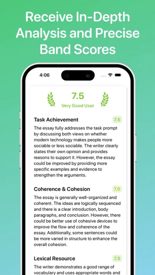 Our unique algorithm offers more than just a score. It provides comprehensive analysis and targeted advice, along with band descriptors to highlight your strengths and areas needing improvement.