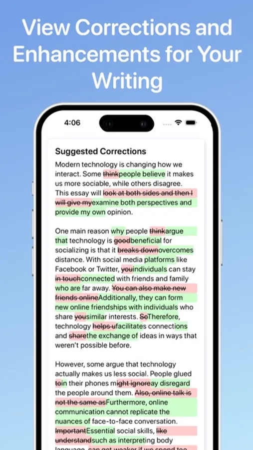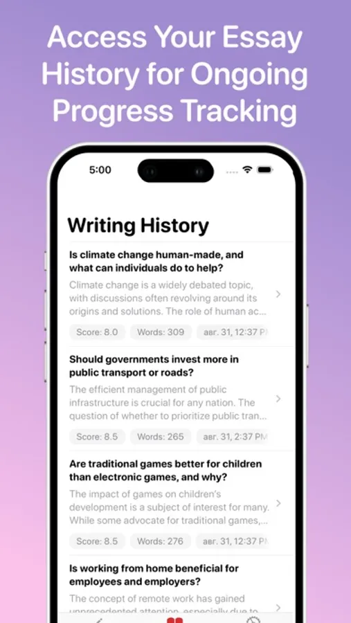 Monitor your improvement with the History tab, which archives your past submissions, scores, corrections, and revised texts. This feature helps you adapt and refine your writing skills over time.