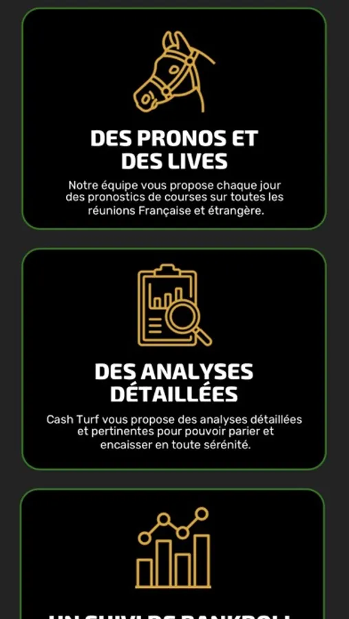 Découvrez Cash Turf, votre compagnon incontournable pour les amateurs de courses hippiques. Notre application dédiée vous offre un accès privilégié à l'expertise des pronostiqueurs chevronnés qui partagent quotidiennement leurs analyses pointues. Que vous soyez novice ou parieur aguerri, Cash Turf est là pour vous aider à prendre des décisions éclairées.