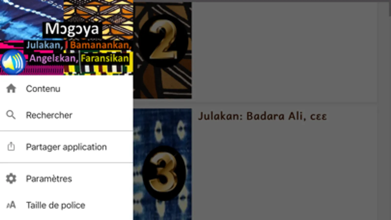 The first part of this app is divided into six chapters, each containing the same sentence read in turn in the four languages: Dioula, Bambara, French and English. The second part is dedicated to each of the four languages, with a chapter in Dioula entirely and also a whole chapter for Bambara, French and English.