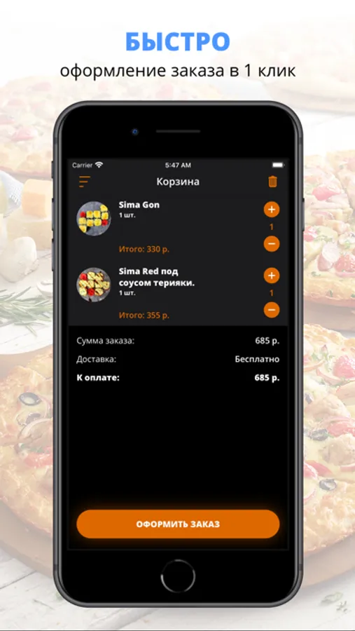 Скачивайте наше приложение, оформляйте заказ и наслаждайтесь любимой едой, где бы Вы ни были! Приятного аппетита!
