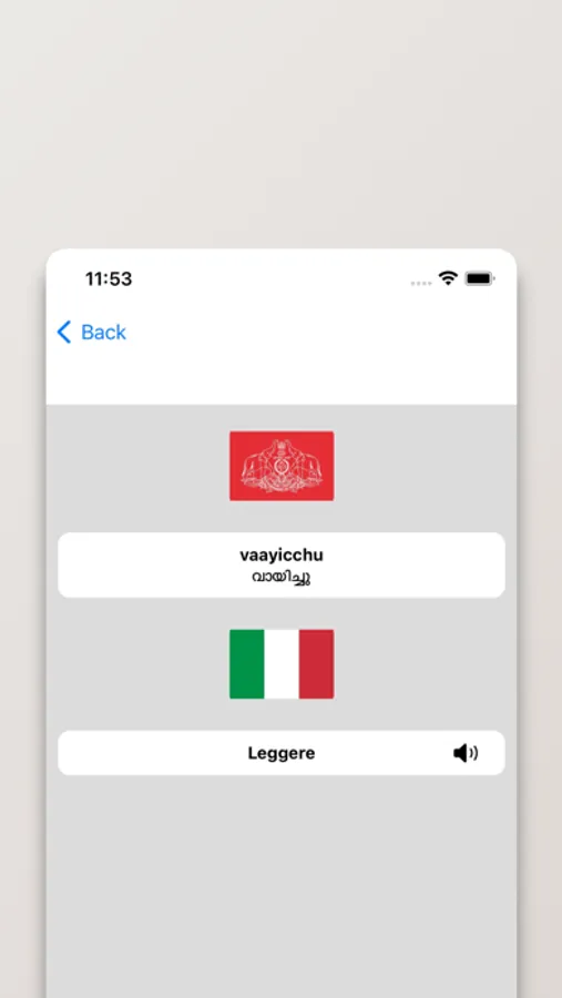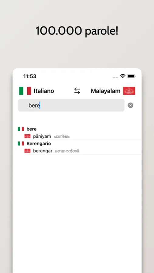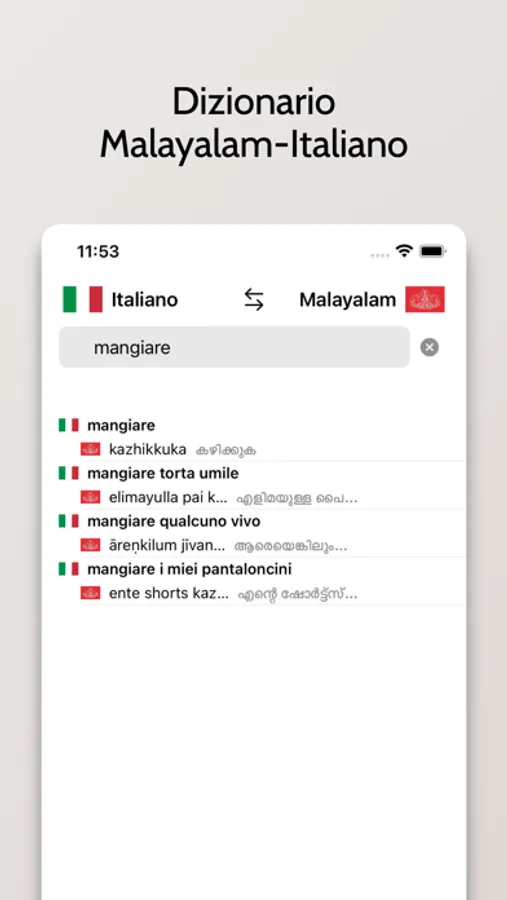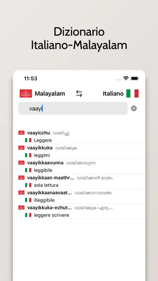 - Possibilità di cercare a partire da parole in Italiano o Malayalam