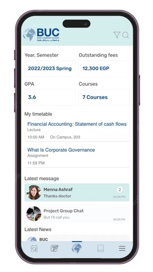 The official BUC students app is designed to offer real-time access to key information in order to enhance their learning experience. It also offers extended communication links and provides a valuable tool for students to connect with their professors and fellow peers. Students also can view on their home page important university announcements and news.
