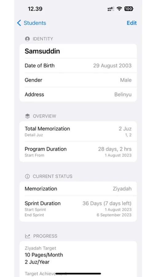Maintain comprehensive memorization data for each student, aiding progress evaluation.