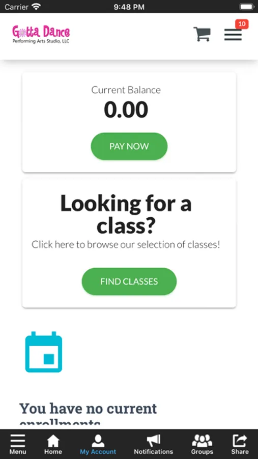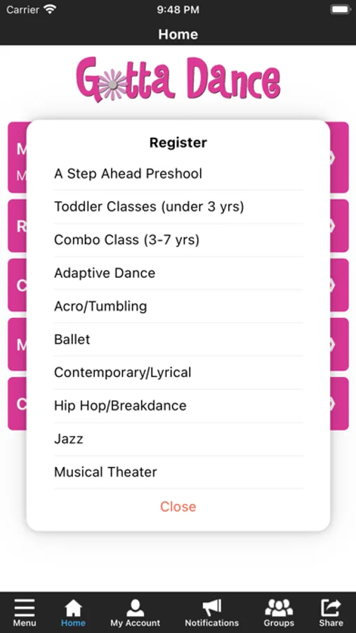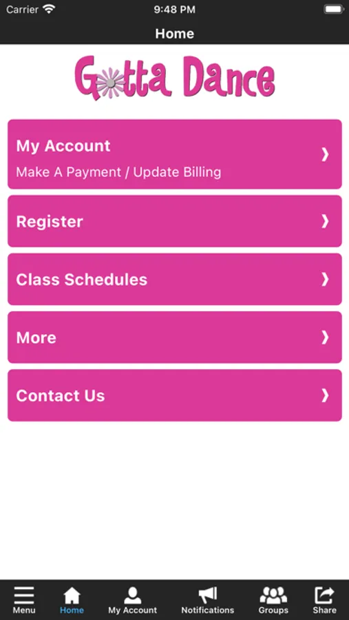 The Gotta Dance Performing Arts Studio app allows you to manage your account with ease, register for classes, parties, and special events. You'll also receive important notifications about class changes, closings, registration openings, special announcements, and upcoming events.