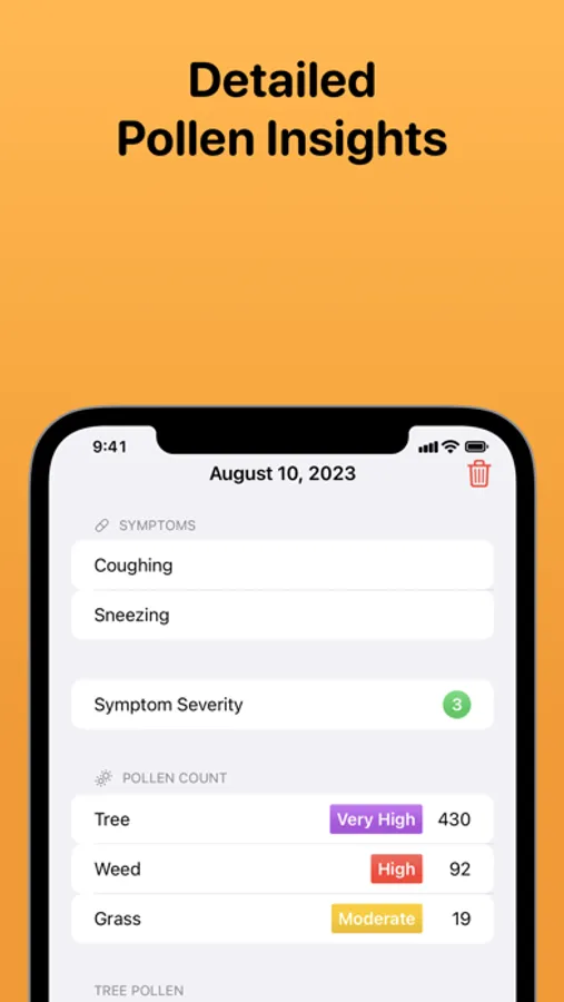 Trend Analysis: Visualize your allergy trends through intuitive charts, comparing symptoms over time and against varying pollen levels for a deeper understanding of your allergy landscape.