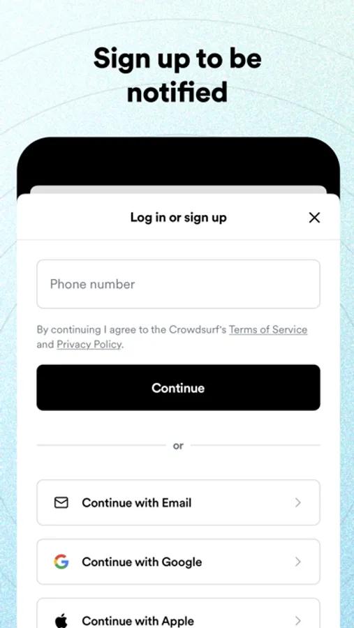 By using this App, users agree to Crowdsurf's Terms of Service (found at https://crowdsurf.xyz/legal/terms) and Privacy Policy (found at https://crowdsurf.xyz/legal/privacy) .