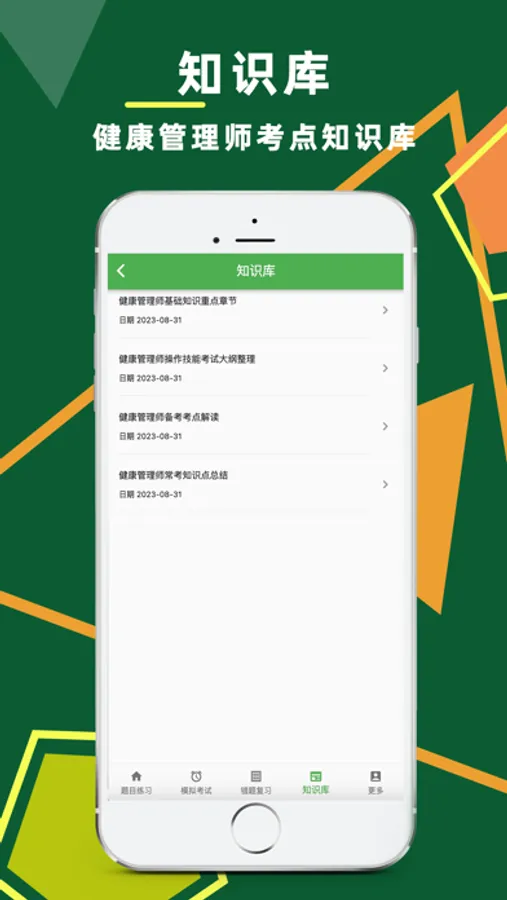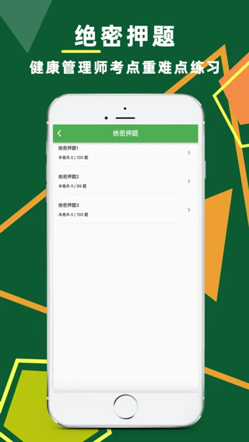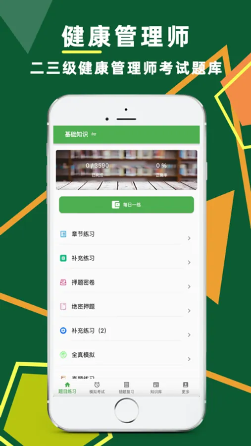 健康管理师考试题库包括章节练习+高频考点+历年真题,健康管理师是营养师、心理咨询师 、体检医生、预防医学医生、健康教育专家、医学信息管理人员的综合体,报名参加认证的健康管理学员经培训,通过考试后获取国家卫计委颁发的职业资格证书,获得健康管理师上岗资格,健康管理师职业资格鉴定考核分别为:高级健康管理师(三级健康管理师)、二级(技师)、高级技师(一级),考试科目有理论知识考试、操作技能考试。