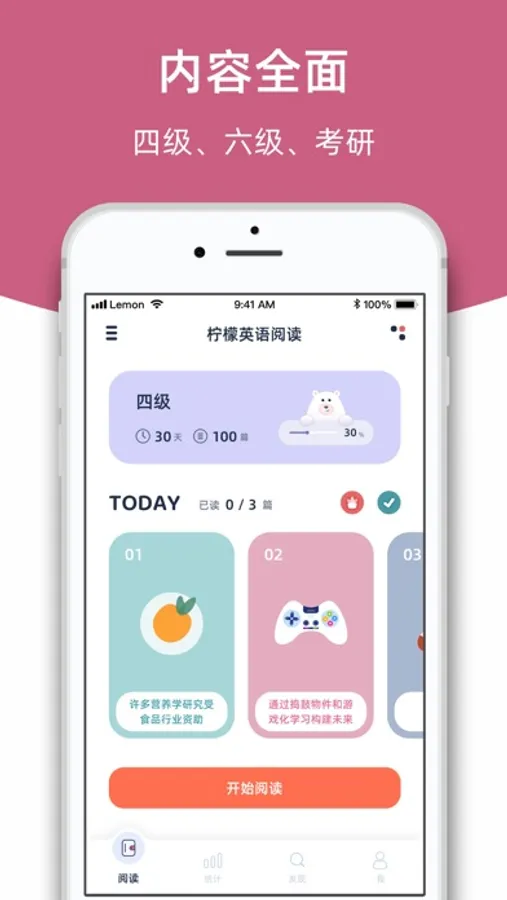 柠檬英语阅读支持四级、六级、考研等考试内容。