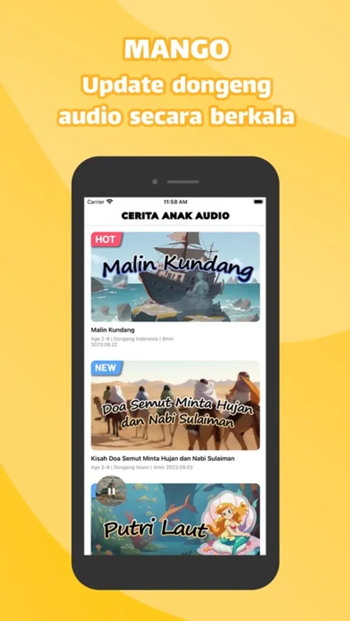 Terdapat berbagai macam cerita berkualitas yang cocok dengan anak-anak Indonesia di Mango, termasuk cerita menarik, cerpen inspiratif, cerita lucu, cerita seru, dsb. Dengan Mango, Anda bisa membaca dongeng pengantar tidur secara gratis, kami menyediakan cerita bergambar yang berkualitas untuk menemani anak-anak hingga terlelap. Di dalam Mango, tidak hanya ada cerita bergambar yang indah dan bacaan literasi yang dapat membantu pembelajaran, tetapi setiap cerita juga memiliki audio yang direkam dengan cermat. Mango, membuat kumpulan dongeng dengan sepenuh hati, menjadi teman anak-anak dengan setiap cerita menarik.