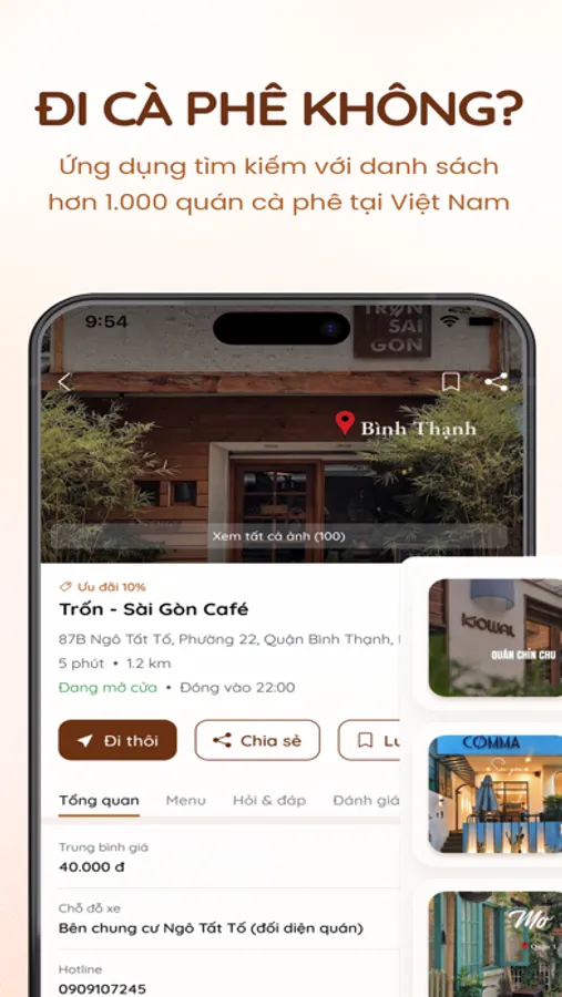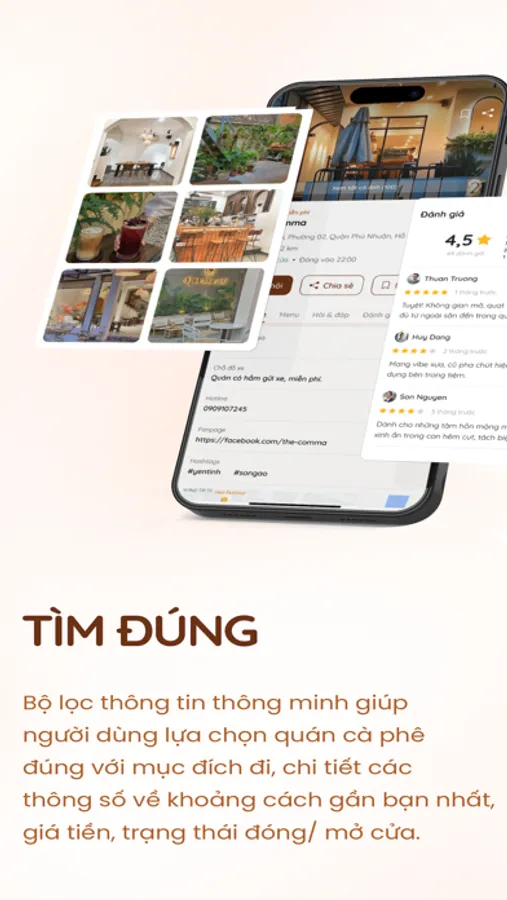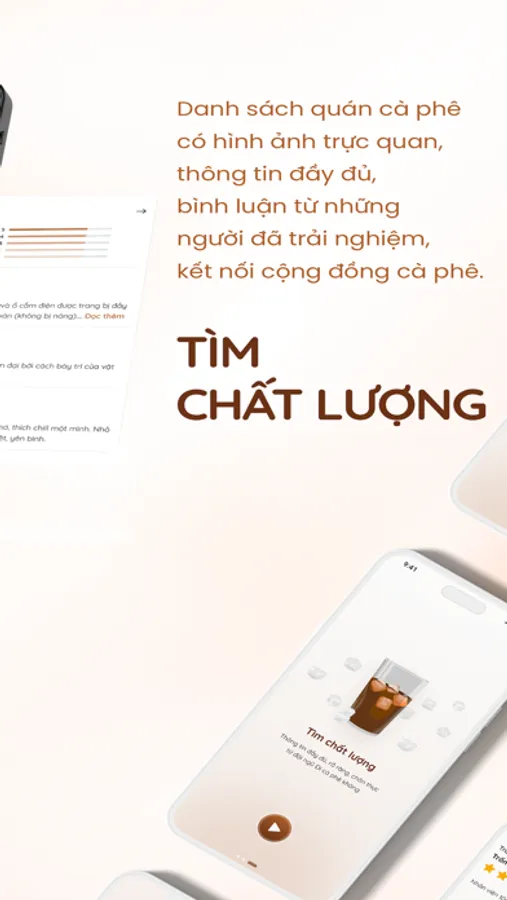 Tìm CHẤT LƯỢNG: Danh sách quán cà phê có hình ảnh trực quan, thông tin đầy đủ về không gian, đồ uống và dịch vụ, tham khảo bình luận từ những người đã trải nghiệm, kết nối với cộng đồng cà phê.