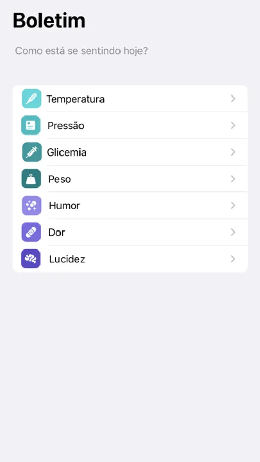 – Parâmetros de saúde (pressão, glicemia, temperatura)