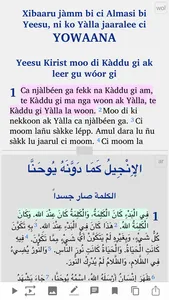 - "verse by verse" to display a verse in Wolof followed by the same verse in one of the other languages of your choice.