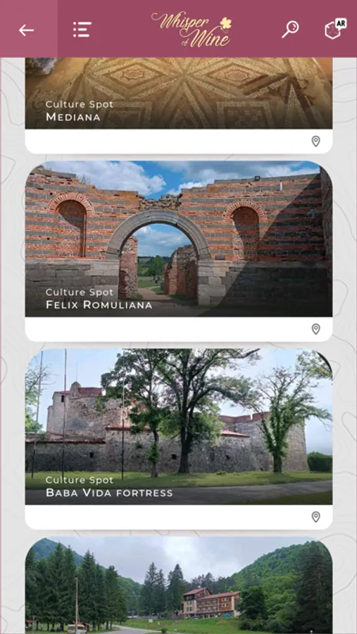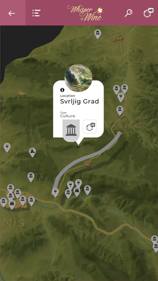 Whisper of Wine aims to activate all five senses on the road for an unforgettable experience of undiscovered and attractive destinations in the cross-border region of Serbia and Bulgaria. AR app provides new, interactive technology in real-time for tourists on the thematic round wine tour proposing digital location mapping of the natural, cultural, historical, industrial, and intangible heritage along the European cultural routes: