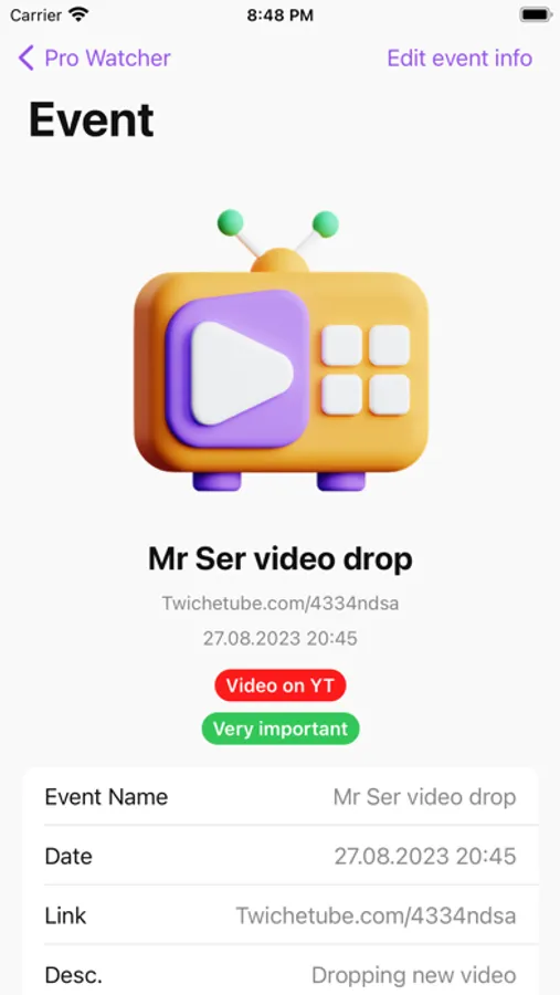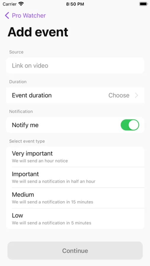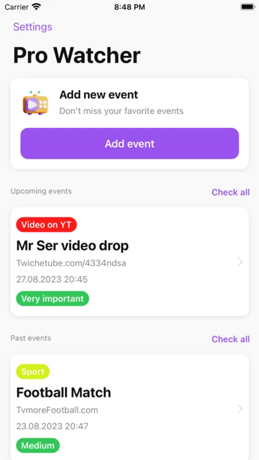 Just add your first event, such as a famous blogger's stream, fill in the details about the title, subject, date, and link to the source. Now you will receive advance notification of the start of the event! And also, all events added later will be conveniently sorted and arranged in Prowatcher!