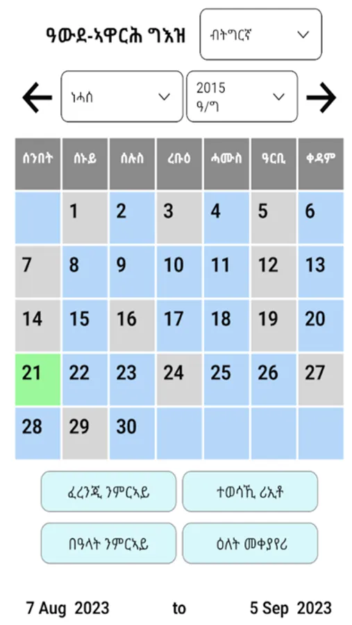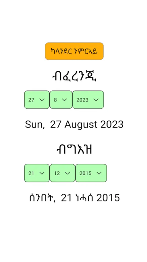 Geez Calendar App helps users to use monthly geez calendar for their preferred geez year. For ease of usage users can toggle inclusion of Gregorian dates to the geez dates. Additionally, the app helps to view the yearly Holy and Fasting dates. Also it helps in conversion of Gregorian date to Geez date or vice versa. Labeling in either Tigrinya or Amharic language is also enabled as per user preference.