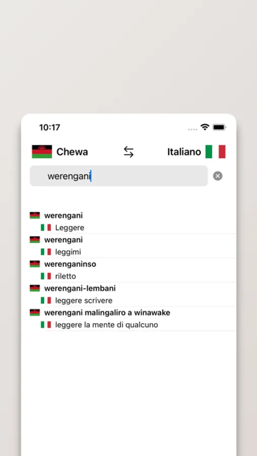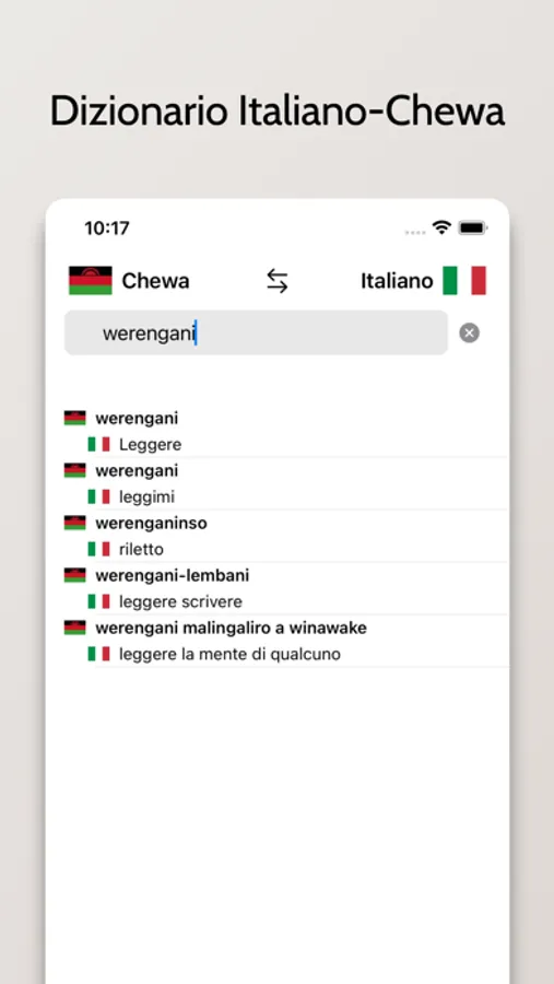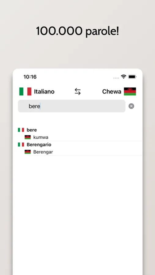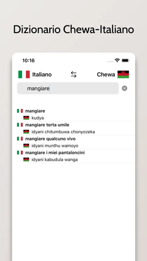 - Possibilità di cercare a partire da parole in Italiano o Chewa