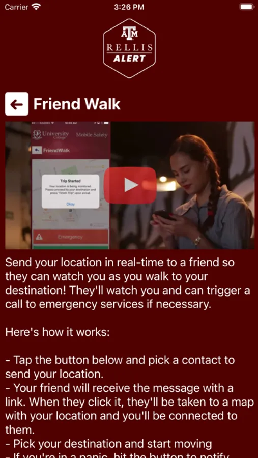 - Friend Walk: Send your location to a friend through email or SMS on your device. Once the friend accepts the Friend Walk request, the user picks their destination and their friend tracks their location in real time; they can keep an eye on them to make sure they make it safely to their destination.