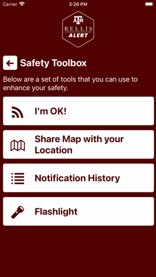 - Safety Notifications: Receive instant notifications and instructions from The Texas A&M University System - RELLIS safety when on-campus emergencies occur.