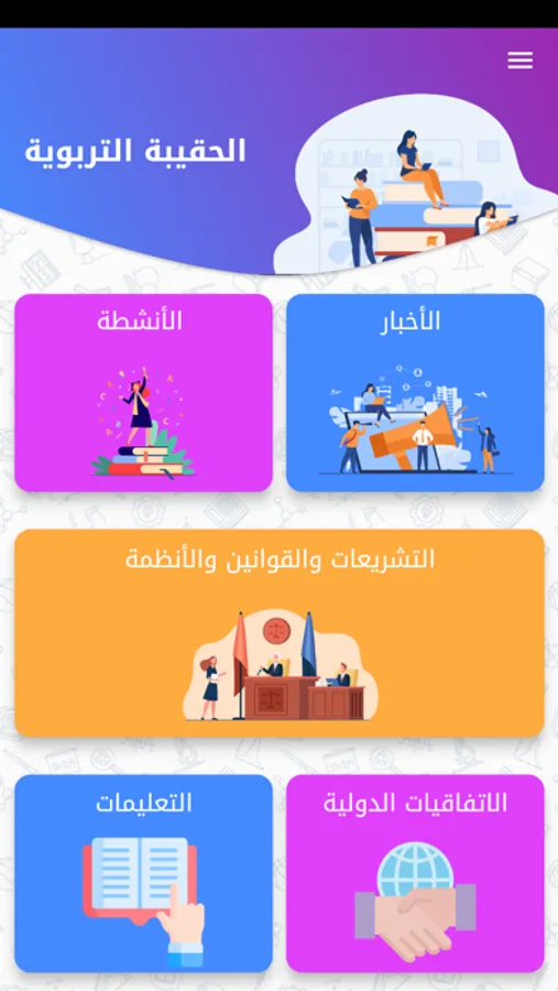 ترجمة لغة الإشارة وتنسيق صوتي: يأخذ تطبيق الحقيبة التربوية مفهوم الشمولية خطوة إلى الأمام من خلال توفير .ترجمة للقوانين والاتفاقيات بلغة الإشارة للصم وتنسيق صوتي للمكفوفين، مما يضمن إمكانية الوصول للجميع