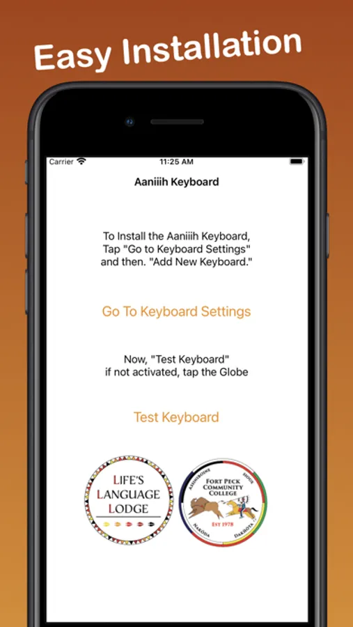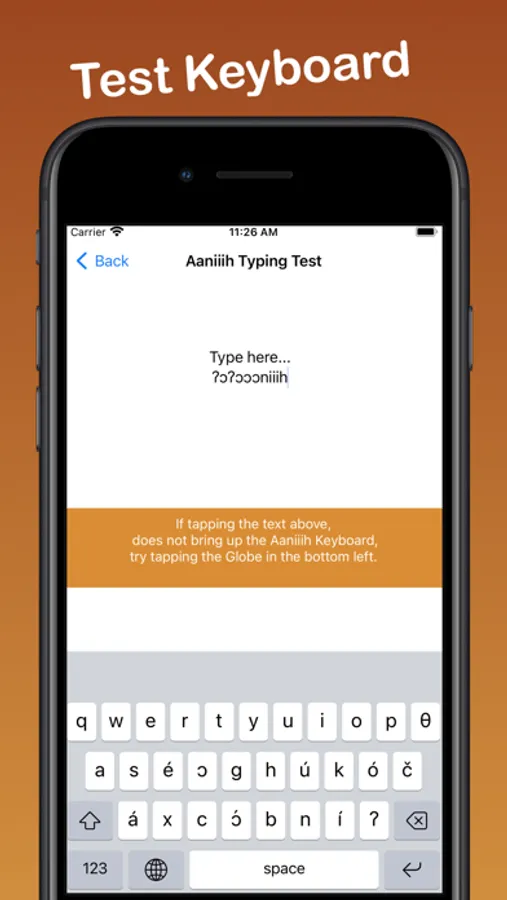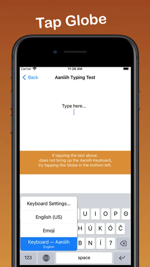 Once installed and selected as a keyboard option, you can switch between Aaniiih and English as you type emails, SMS, MMS, web content, and in any other text-input field. Simply press the GLOBE icon to switch.