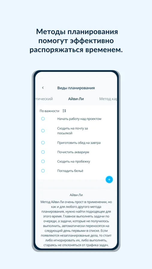 В ToDays есть несколько видов планирования, среди которых метод Айви-ли, метод 1-3-5, метод карточек и матрица Эйзенхауэра. Их главные сходства заключаются в том, что они позволяют ставить задачи и помогают тебе становиться продуктивнее. Различия же в том, как отображаются задачи (например, сортировка по важности или по срочности). Помимо этого, у каждого метода есть свои особенности – чтобы узнать о них заходи в раздел обучения!