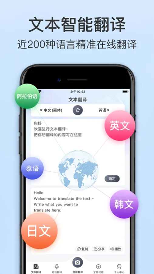 全球翻译通是一款支持多达200种语言的实时在线翻译软件,功能包括文本翻译、语音对话翻译、扫描翻译、音频视频翻译、语音转文字、物体识别翻译等,可以很好的帮您解决在日常办公和生活中的遇到的语言不通的问题。