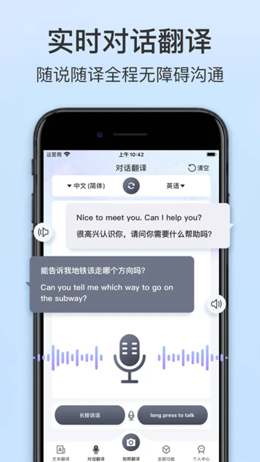 3.对话翻译:与外国人沟通,使用实时对话翻译,快速理解对方表达的意思,录音翻译的同时为您读出翻译的内容