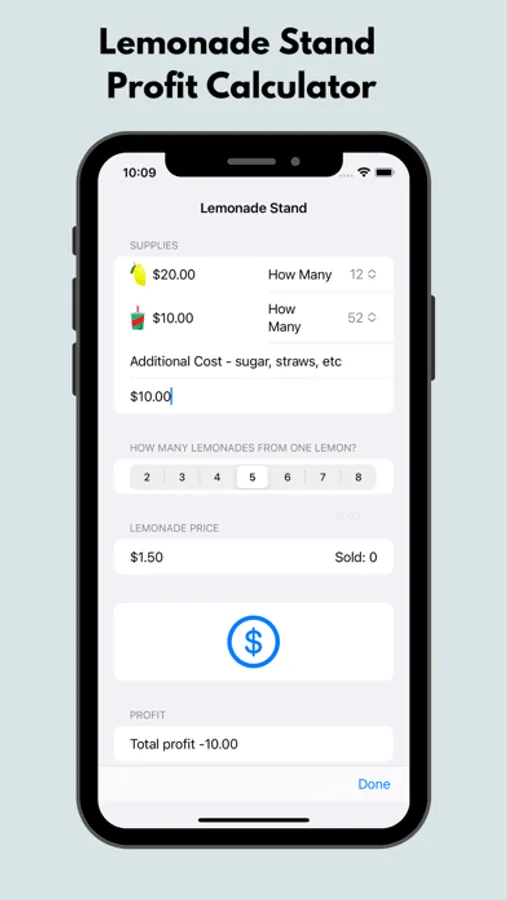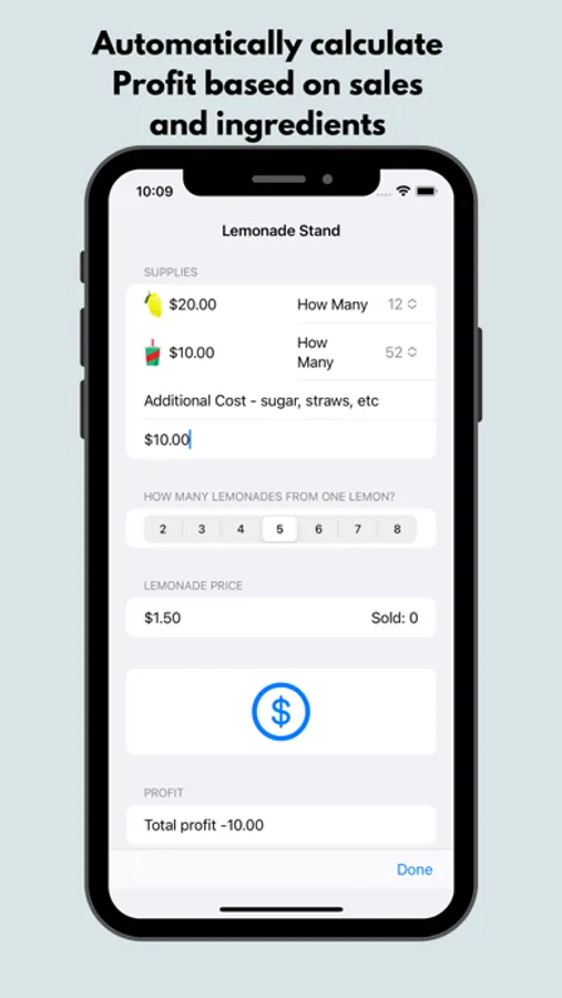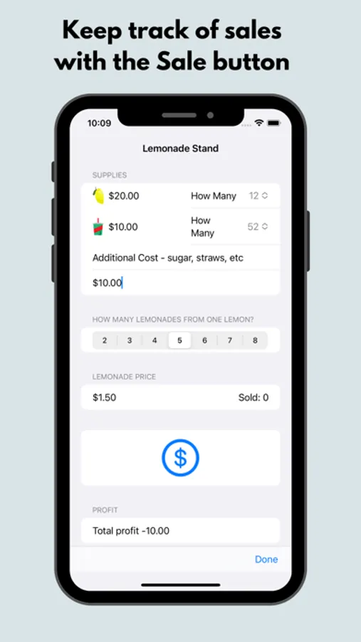 Keep track of your sales by pressing the satisfying Sale button. Each tap will produce a satisfying sound announcing a sale and will also calculate the profits of your lemonade stand.