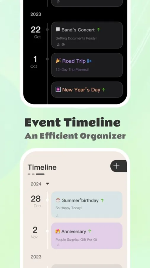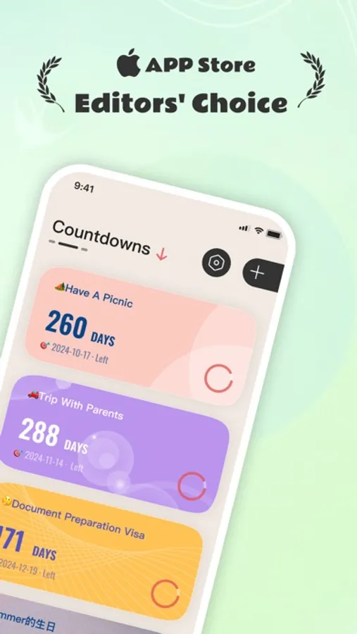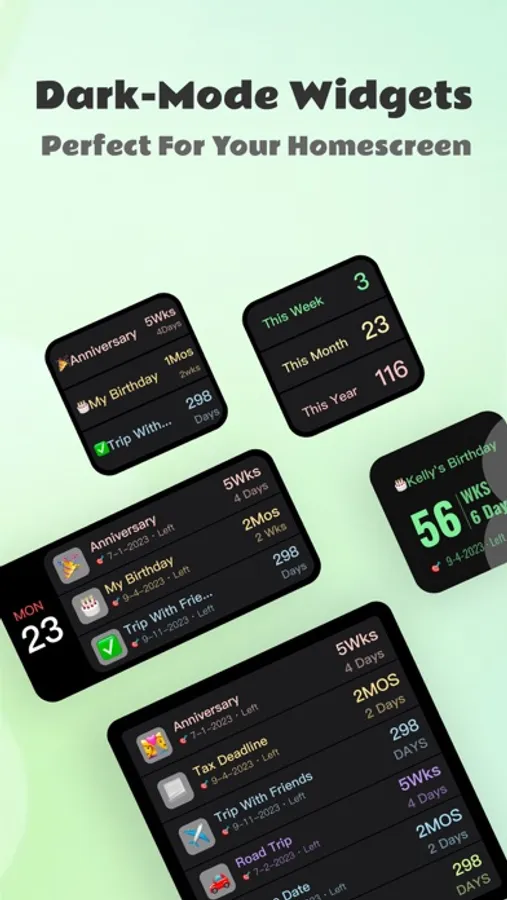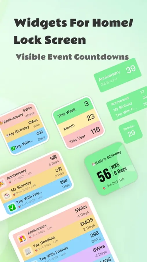 • Quickly create and track countdowns for goals, trips, births, weddings and other important events.