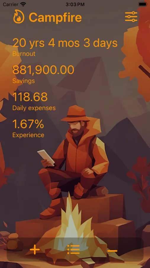 Campfire a straightforward and efficient finance app designed to help lyou manage your personal finances and gain insights into their spending habits. Campfire's main functionality is to track and record numerical values of expenses, auto calculate your average daily spending and estimate the duration your assets can sustain them.