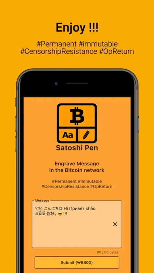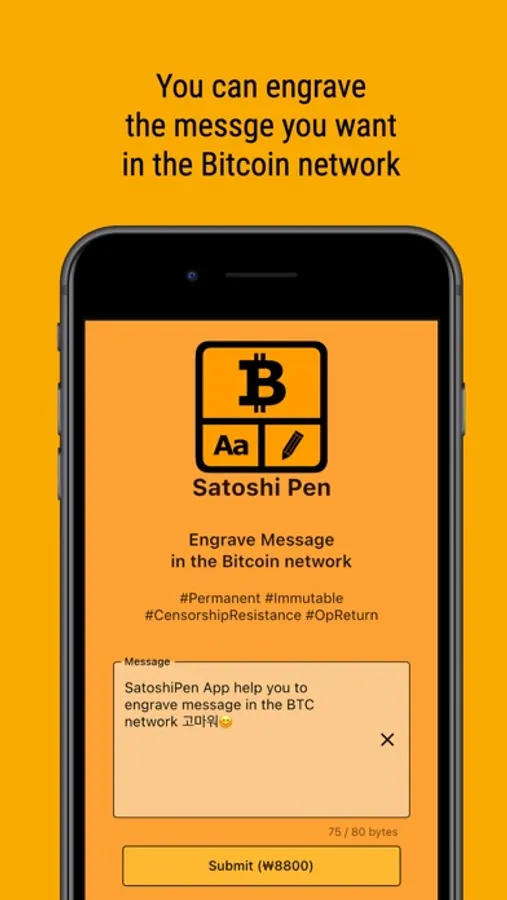 SatoshiPen help you to engrave your message in the Bitcoin network. This message is permanent, immutable and censorhip resistance. This message can be read in the bitcoin network (OpReturnData), anywhere and anytime.