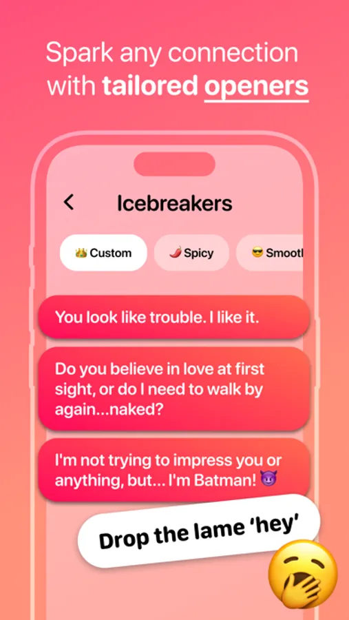 Curated Icebreakers: Choose from a range of categories to match your style. Fill in noticeable traits, and tap to generate standout opening lines. Copy, paste, captivate.