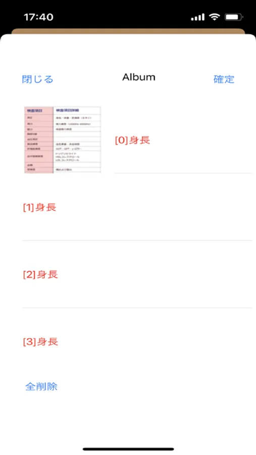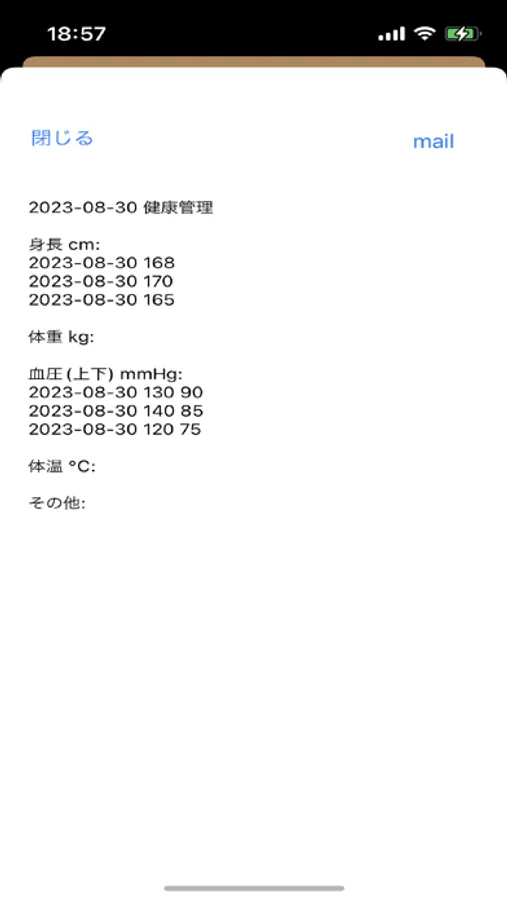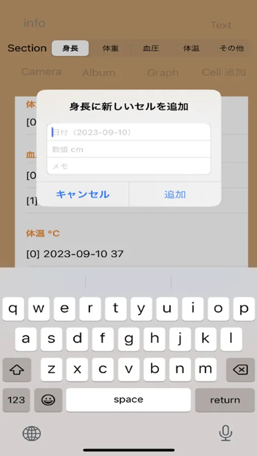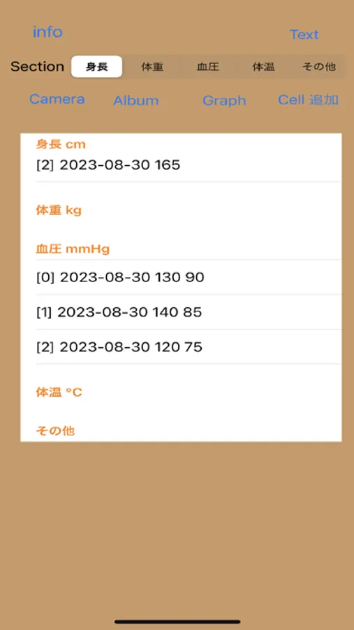 このアプリは、身長・体重・血圧(上下)・体温・その他の5セクションからなる日付つき健康管理プログラムです。セクションはセグメントで指定し[cell 追加]ボタンで追加します。画像については各セクション4枚ずつ合計20枚まで登録・表示することができます。[Album][Camera]ボタンを押した後セルをタップしてアルバムやカメラを起動して画像を追加してください(病院に提出した受診票等を撮影し、差替え=上書きも可能)。追加したセルを押すとセルの内容(数値等)と画像を表示できます。また、セクションをセグメントで指定して[行移動]ボタンを押すことでスクロール移動します。追加したセル(文字列)は行を横方向にスラップすることで削除できます。また、[Album][Camera]ボタンを押した後、画像についても行をスラップしたり[全削除]ボタンを押して削除することができます。さらに、[Text]ボタンを押して全てのセルの内容をテキスト出力することができ、メール送信も可能です。また、セクションをセグメントで指定して[Graph]ボタンを押すことで、当該セクションのグラフを表示します(Google Chart API)。