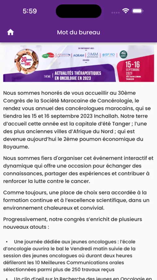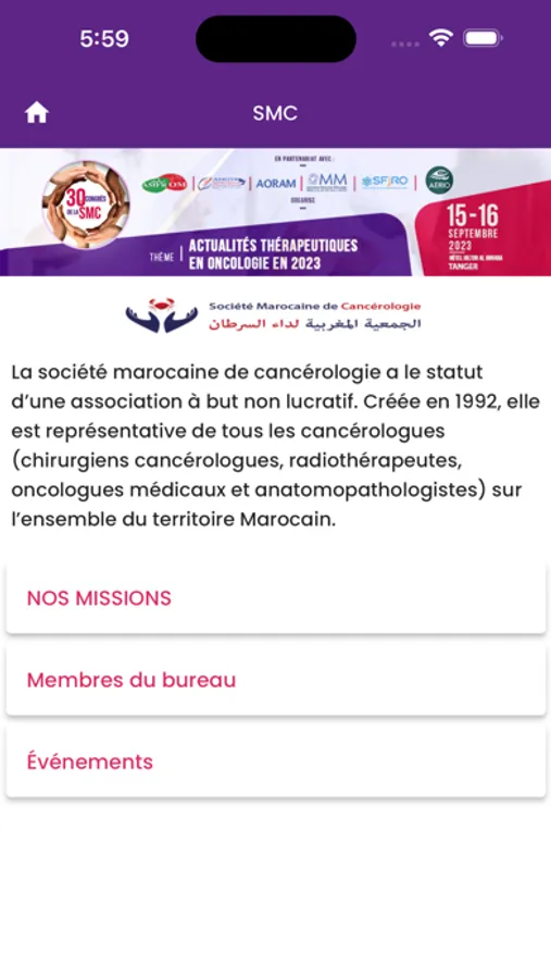 Application officielle du 30ème Congrès National de la SMC 2023 à l'hôtel Hilton houara de Tangier. Explorez l'application et ses nombreuses fonctionnalités :
