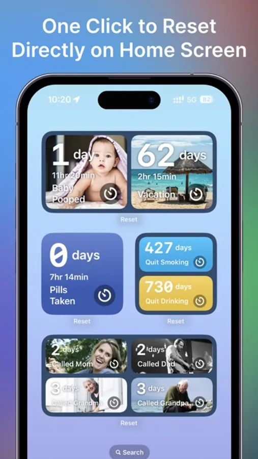 Transform your home screen into a dynamic reminder center with Reset, the interactive widgets app. Never forget important tasks or milestones again. With Reset, you can effortlessly add reminders right on your home screen and see how much time has passed since you last completed them.