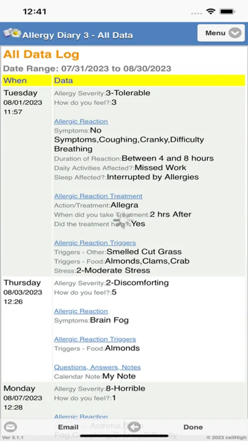 Are you like one of the millions of people struggling with Allergies? Allergy sufferers can benefit with lifestyle changes and by recognizing your allergy triggers. How can an Allergy Diary help? Allergy Diary has a new “Trending and Forecasting” module that shows you which triggers cause your allergies and alerts you when it predicts an impending allergy. It makes it easy to maintain all of your Allergy health records and information. This will help you feel better and will allow you to take control of your Allergies. Keeping track of your allergic reactions, symptoms, treatments and possible allergic triggers on a daily basis is not only a helpful thing to do but can be interesting and rewarding with Allergy Diary. Allergy Diary makes it easy to keep track of your Allergy experiences, health records, graphing your patterns, and emailing reports. Do you want all of your Allergy records and information at your fingertips so that you can start feeling better? Allergy Diary can help.