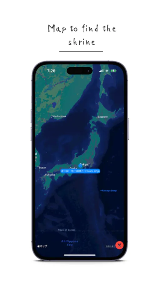 Map to find the shrine: A map is included to easily locate the shrine. This feature will be enhanced as the iOS version is upgraded.