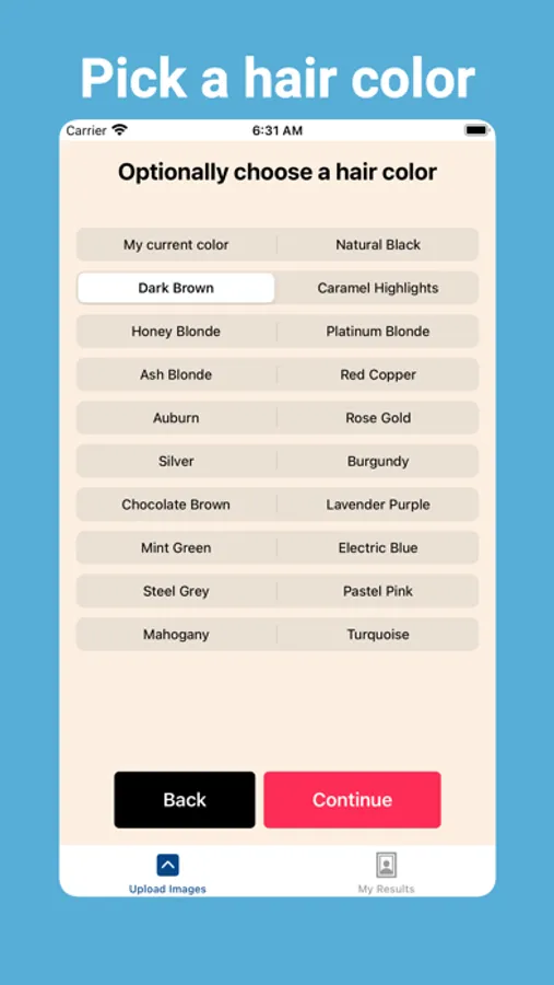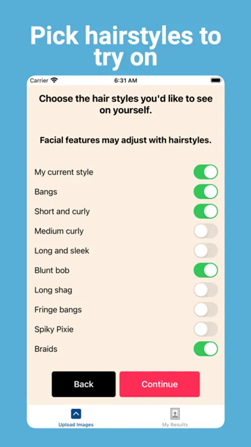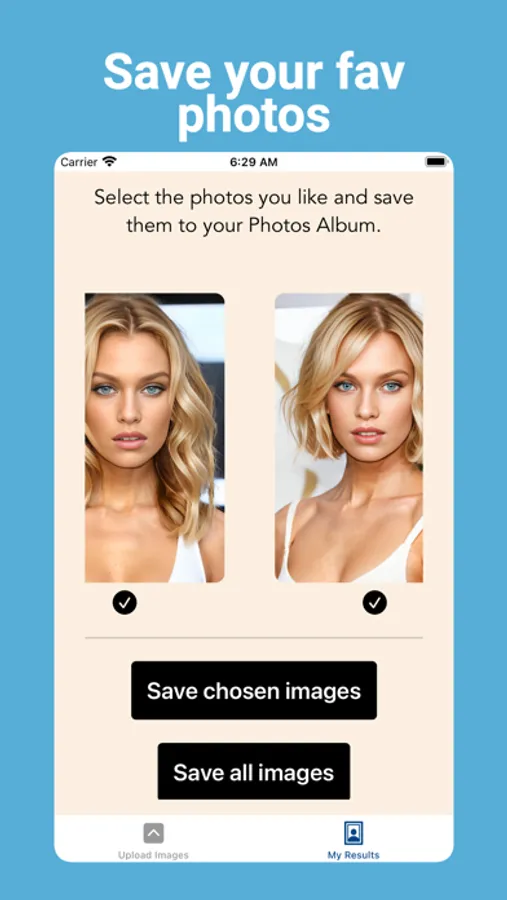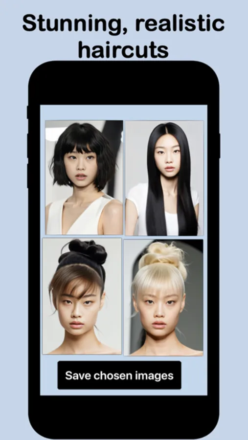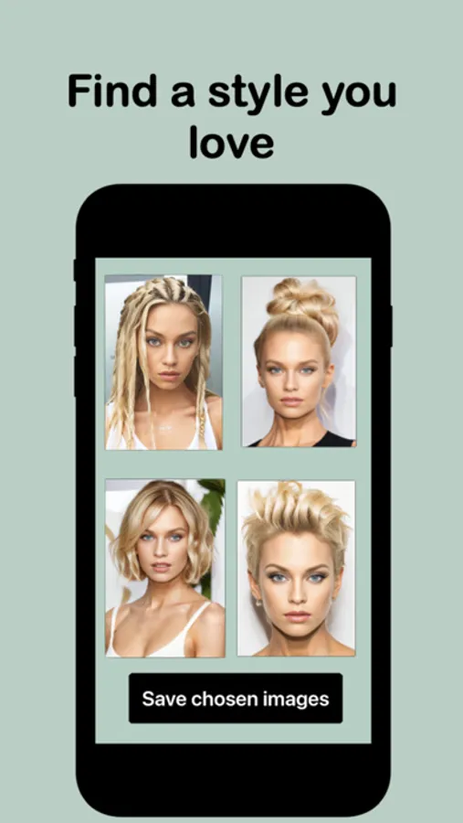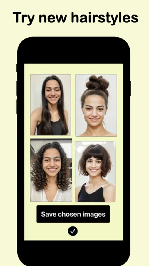 The process is simple. Just upload 10-30 selfies of yourself, making sure you follow the guidelines for best quality, and after 30 minutes we'll deliver hairstyle pictures with your face straight to your phone. You can choose which photos to download.