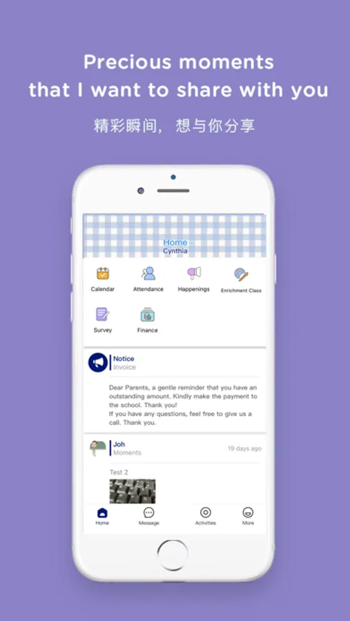 Moments: Never miss a precious moment of your child's learning journey in school as teachers share memorable photos with you over our app! Like a specially tailored Facebook album for your child, you can comment and communicate with teachers as you deem fit.