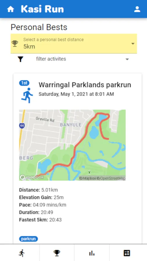 Kasi allows you to quickly search, filter, categorise and rank your runs based on almost any metric including personal best distances, pace, duration, heart rate, cadence and more.