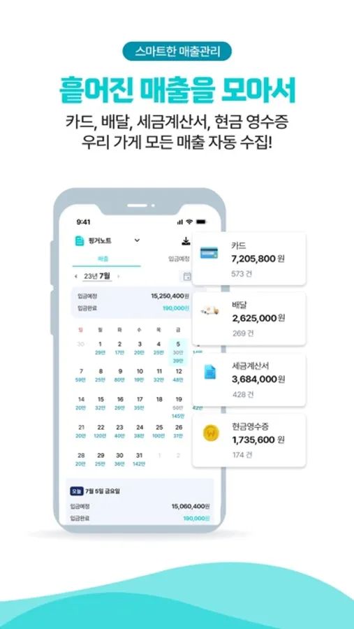 카드, 배달, 현금 영수증, 세금계산서까지 흩어져 있는 우리 가게의 모든 매출을 자동 수집하여 리포트 해드립니다.