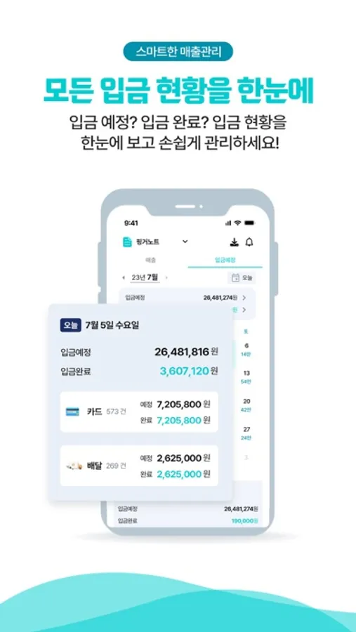 오늘 얼마 입금 되지? 내일 얼마 입금 될까? 모든 입금 현황을 한눈에 보고 손쉽게 관리하세요. "들어온 돈", "들어올 돈"을 캘린더로 확인할 수 있습니다.