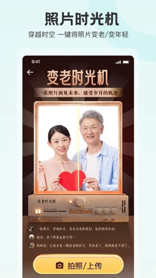 照片时光机:通过一键操作,您可以轻松地让自己看起来更年轻或更年长,回溯过去或探索未来,享受有趣的时光旅程。