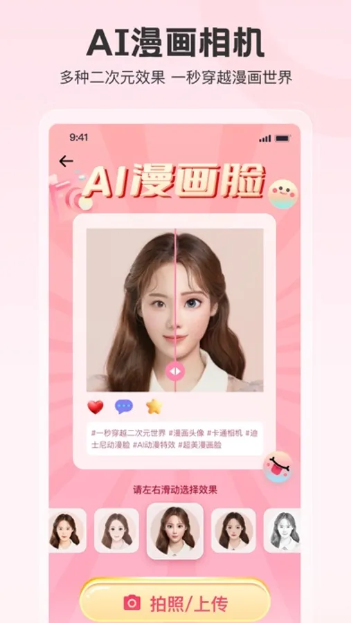 漫画相机:我们的漫画相机功能可以一键生成卡通头像和漫画效果,满足各种风格的需求。无论您喜欢3D风、水墨风、卡通风还是其他任何风格,我们都能满足您的要求。